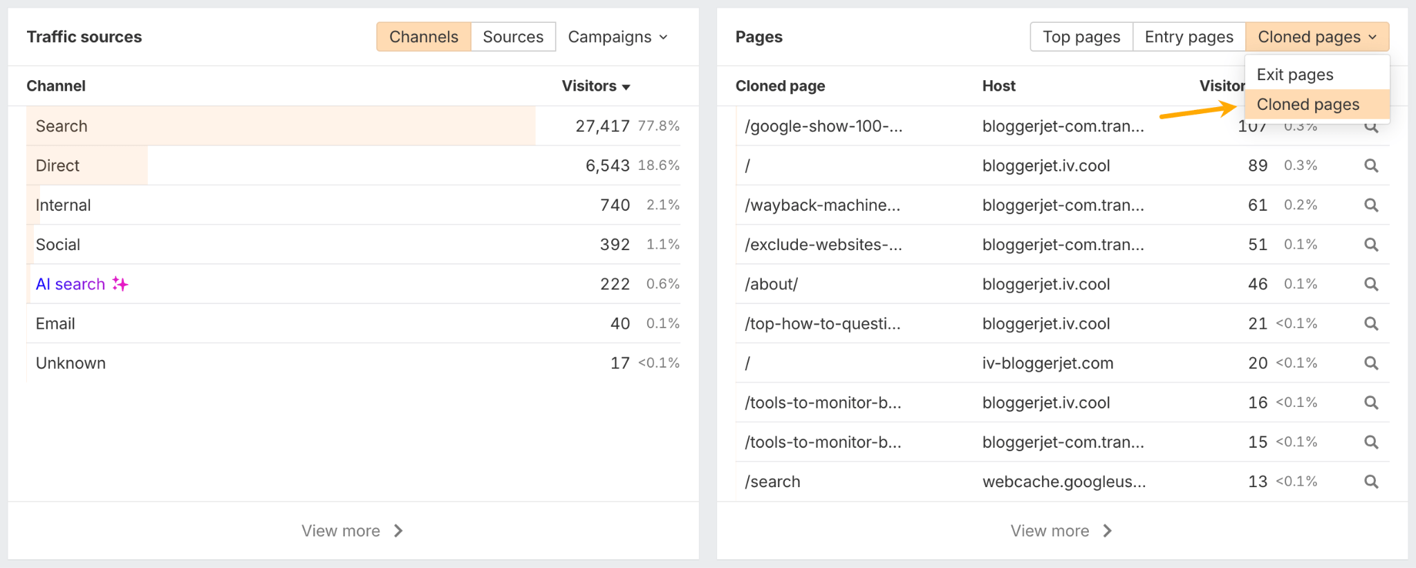 Usa la nueva vista Páginas clonadas en el informe de Páginas para ver cuándo tu contenido aparece en dominios externos – esto puede pasar cuando alguien inserta tu página en un iframe o la copia, o cuando aparece a través de servicios como Google Translate.