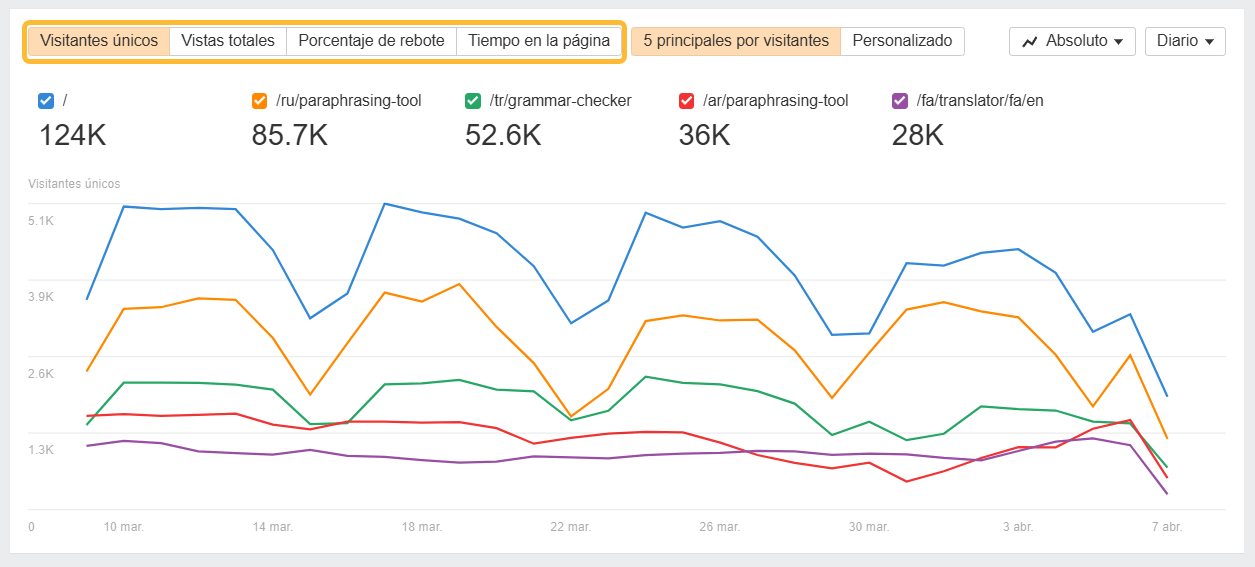 Explorar las tendencias de los visitantes ahora es más fácil. Ahora, al hacer clic en “Ver más” en la parte inferior de cualquier widget, se muestra un gráfico que muestra los cinco resultados principales de los visitantes a lo largo del tiempo.