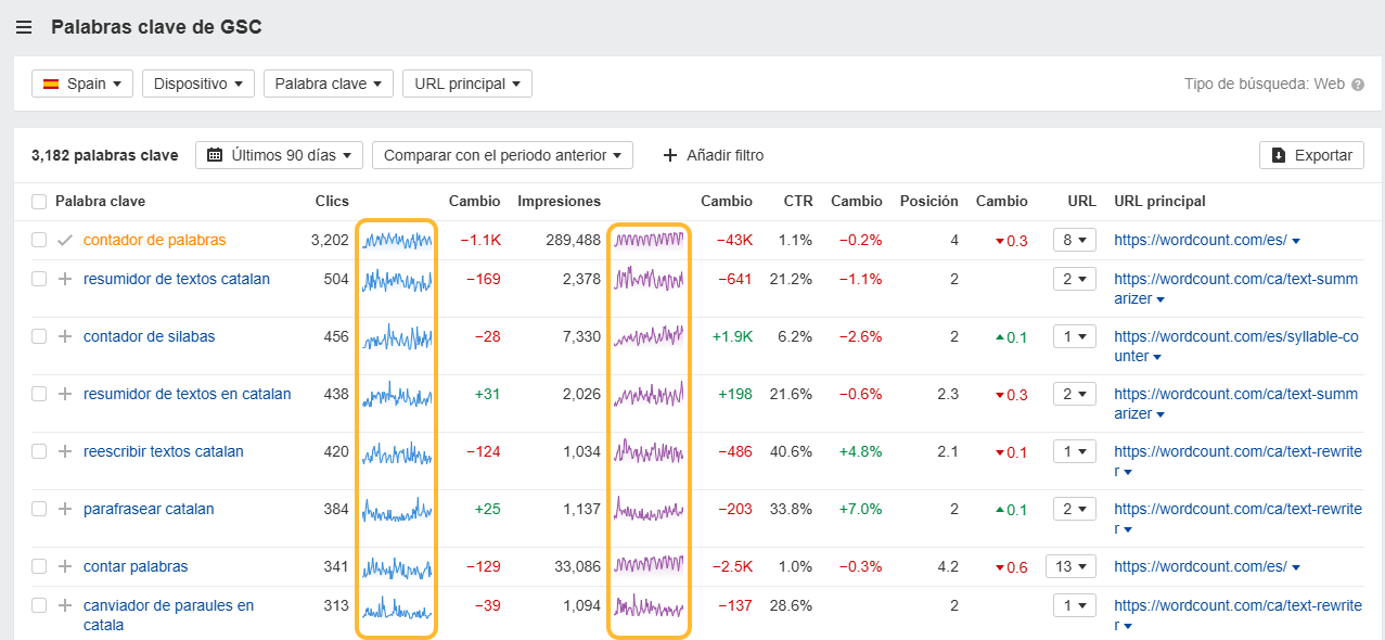 Los informes de palabras clave y páginas de GSC ahora incluyen minigráficos que te permiten detectar al instante tendencias de clics e impresiones, tanto para tus palabras clave como para tus páginas, sin tener que hacer investigaciones extra.
