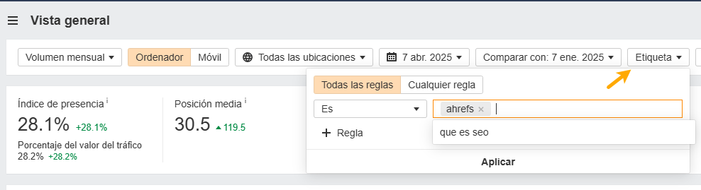 El filtro de etiquetas en los informes de Rank Tracker ahora te permite crear varias reglas y aplicar distintas condiciones, haciendo que segmentar datos y seguir el rendimiento sea más fácil que nunca.