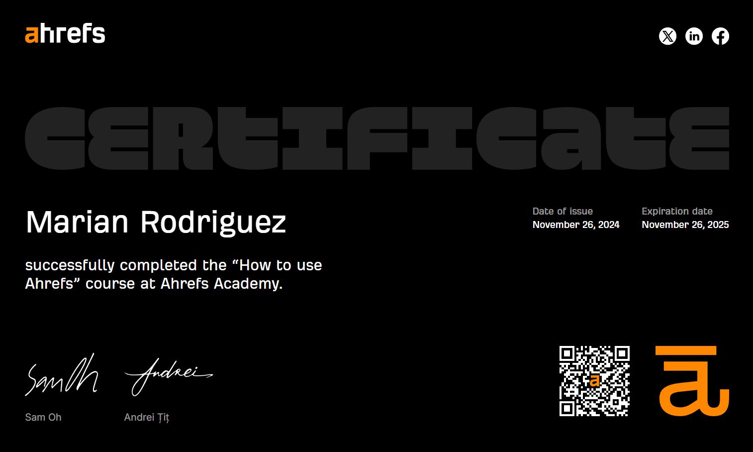 Y no te olvides de compartir tu logro en redes sociales con el hashtag #ahrefscertified para tener la oportunidad de ganar una caja de regalos.