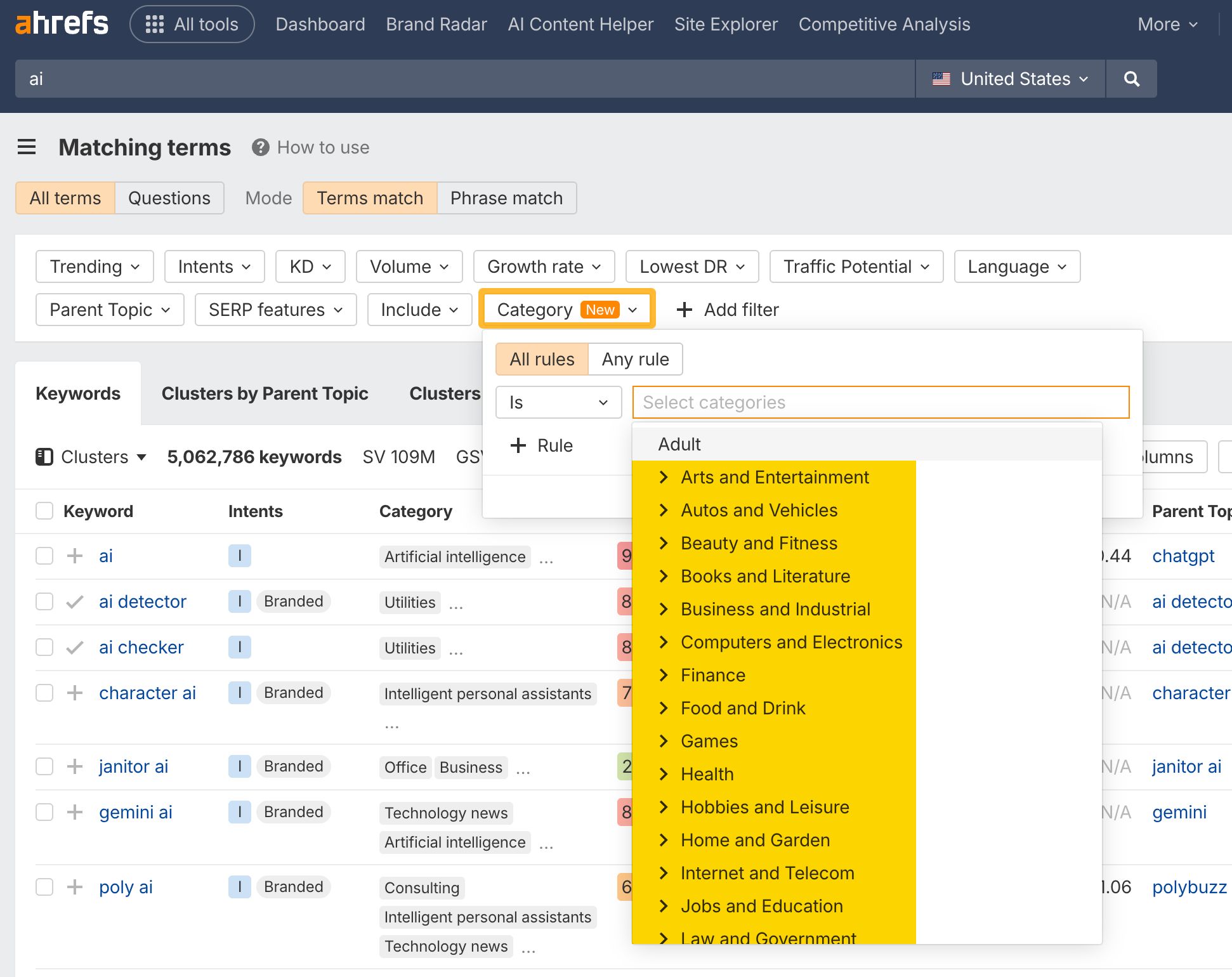 El filtro por categoría ayuda a acotar los keywords relevantes para un nicho específico, haciendo la investigación de keywords más rápida y enfocada.