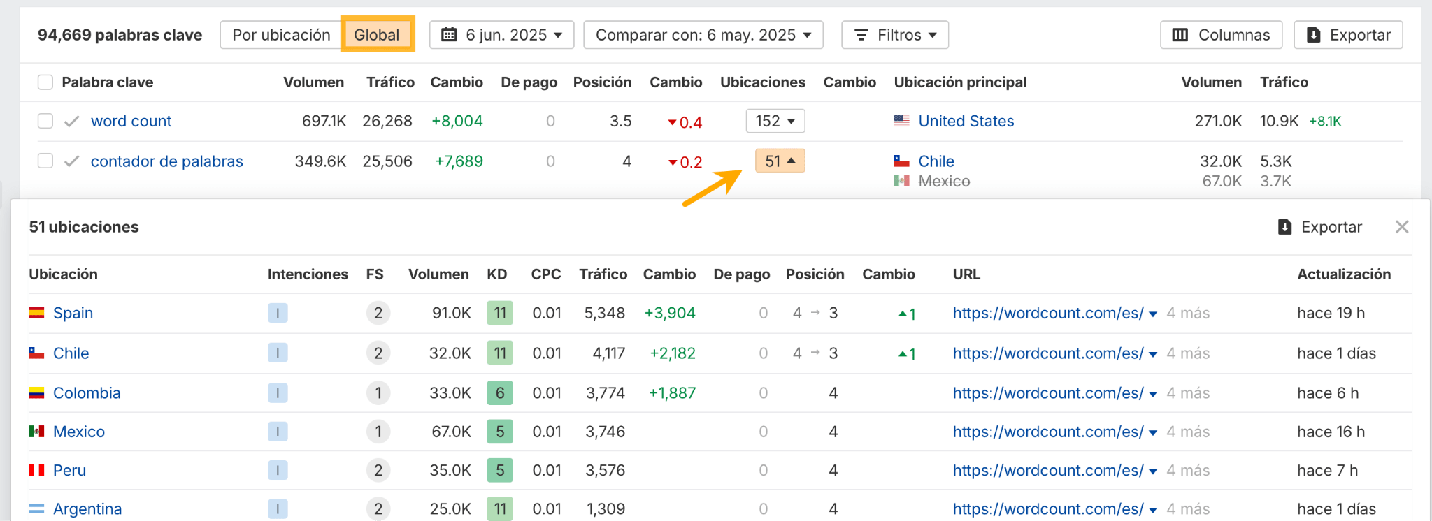 Activa la opción “Global” para ver el volumen de búsqueda global y el tráfico de cada palabra clave, junto con una lista de todos los países donde se posiciona tu sitio. Es una forma sencilla de obtener una visión completa de la demanda de búsqueda de tu marca en todo el mundo, sin tener que cambiar entre varios informes de ubicación.