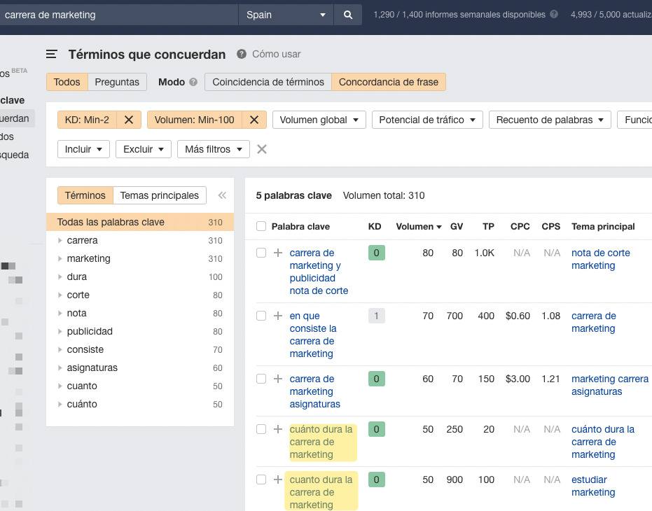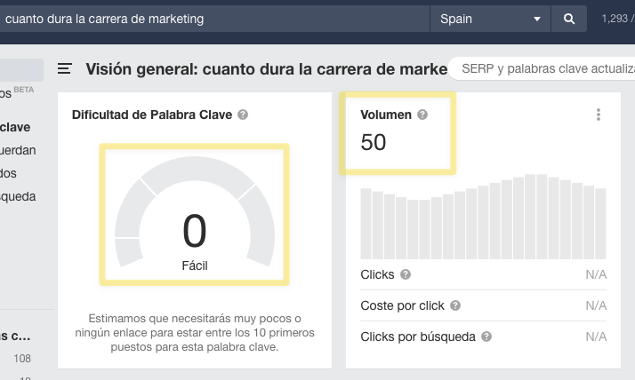 Una comprobación rápida en Explorador de Palabras Clave reveló que “cuánto dura la carrera de marketing” es en realidad una palabra clave con una baja puntuación de KD.