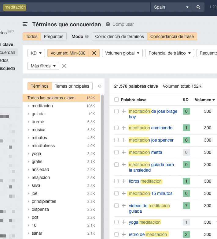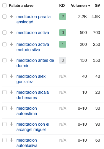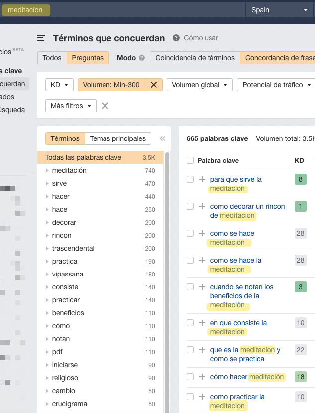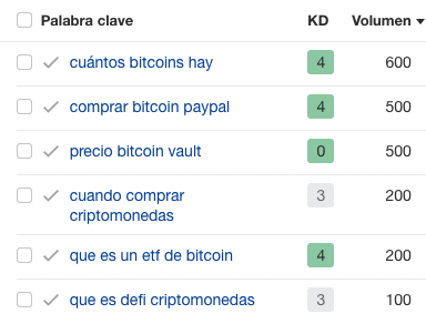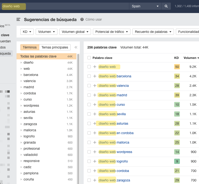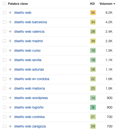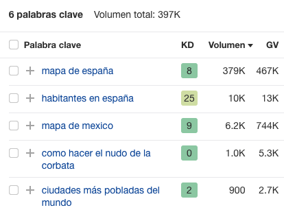 Si tu web es nueva y apenas tiene “autoridad” te recomiendo que uses el filtro de KD (dificultad de palabra clave), que te ayuda a encontrar las keywords menos competitivas.