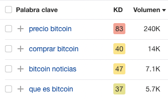 Todas las palabras clave de arriba tienen una puntuación elevada de Keyword Difficulty (KD o dificultad de keyword). Esto quiere decir que será increíblemente difícil conseguir llegar a la primera página de Google con cualquiera de ellas. Y si tu sitio web es nuevo, esto puede ser directamente imposible.