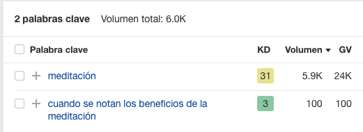 Por ejemplo, la keyword “meditación” es una palabra clave de “cabeza” o head porque recibe 5.900 búsquedas al mes. La palabra clave “cuando se notan los beneficios de la meditación” es una palabra clave de larga cola o long-tail porque solo recibe 100 búsquedas al mes.