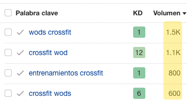 Como puedes ver en la captura de pantalla superior, esta palabra clave long-tail tiene una variante mucho más popular: “wods crossfit” (1.500 búsquedas). Si eres capaz de posicionar para esa búsqueda, automáticamente también posicionarás en sus palabras clave long-tail de apoyo.