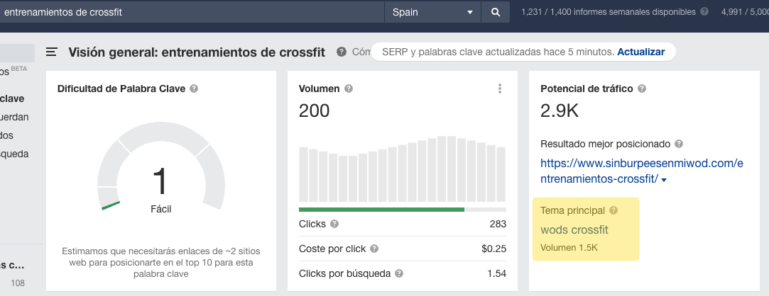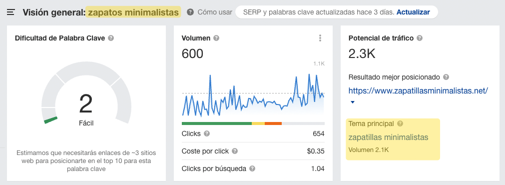 El Tema Principal sugiere que esta palabra clave long-tail es simplemente una variación de la búsqueda “zapatillas minimalistas” (2.100 búsquedas).