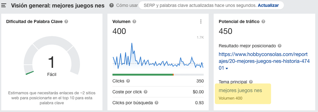 Cada vez que introduces una palabra clave en Explorador de Palabras Clave, revisamos la página mejor posicionada para esa keyword y vemos si existe una búsqueda más popular para la que esta página esté posicionada.