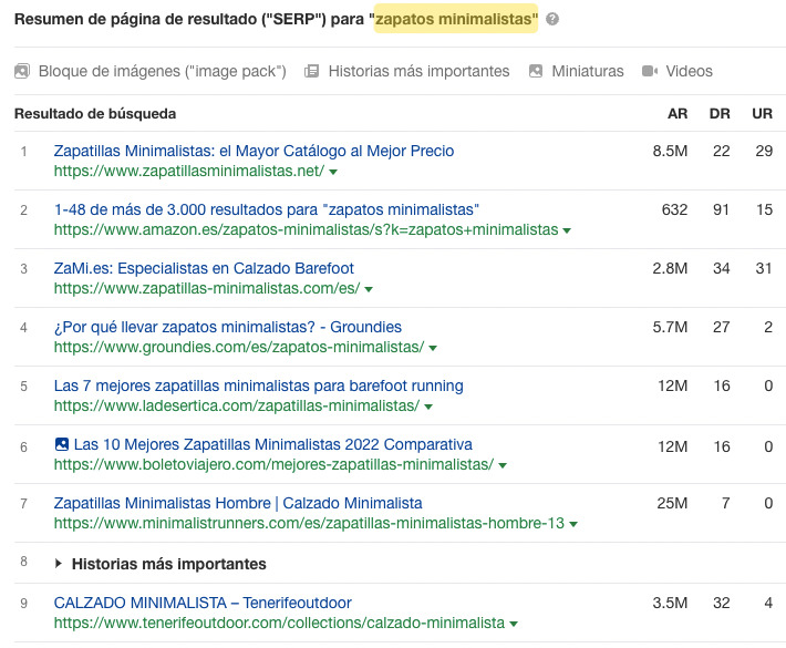 Y si miramos a los principales resultados de la palabra clave long-tail “zapatos minimalistas”, casi ninguno parece hablar de “zapatos”, más bien hablan de “zapatillas”.