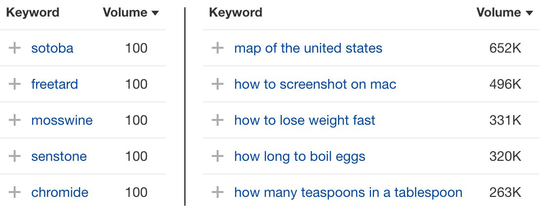 El tema es que hay muchas palabras clave de una sola palabra que reciben menos de 100 búsquedas mensuales.