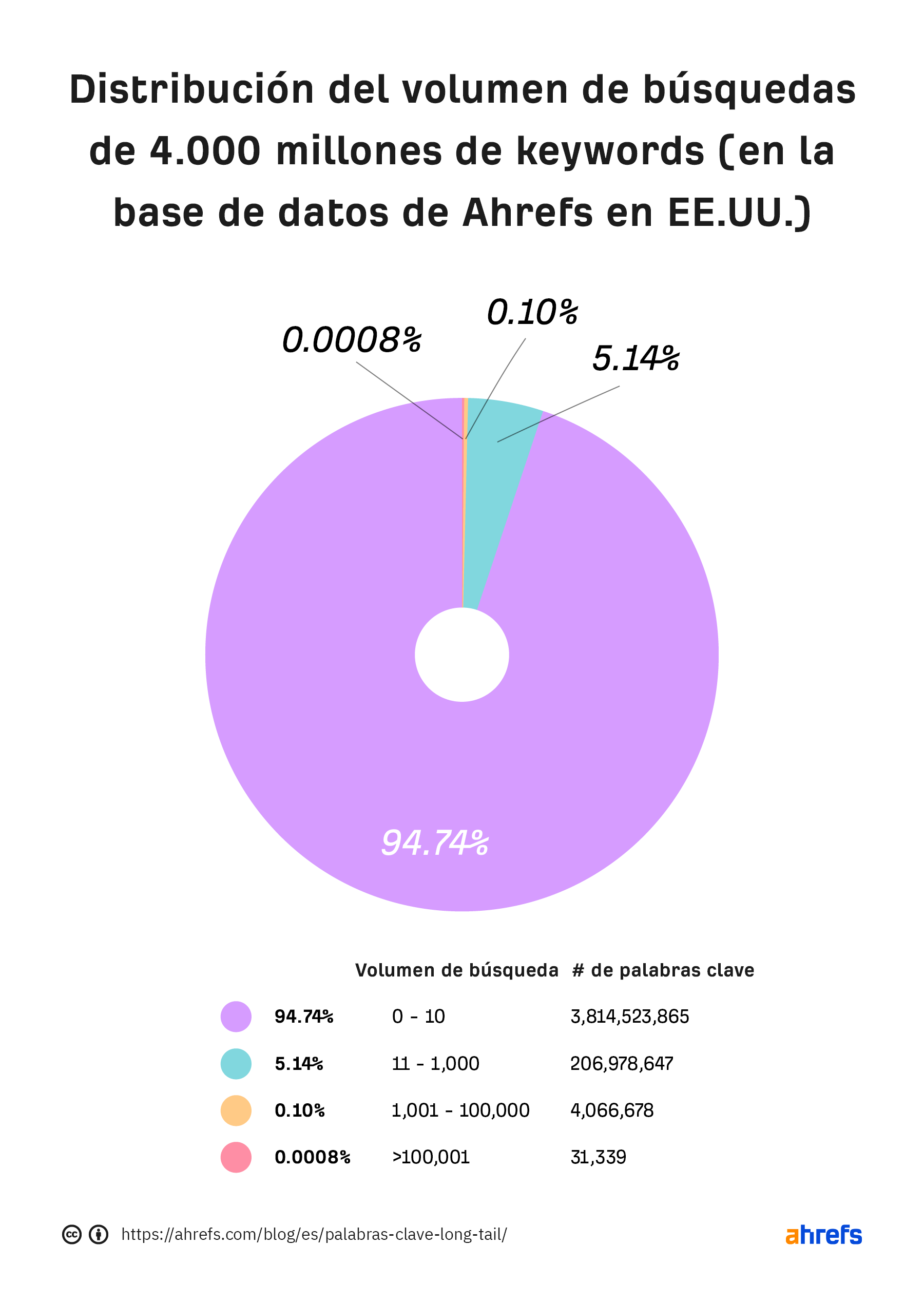 Para ser precisos, en la base de datos de Estados Unidos (que es la más grande del sector, por cierto) hay solo 31.000 palabras clave con volúmenes de búsqueda de más de 100.000 búsquedas al mes; por otro lado, hay 3.800 millones de keywords que tienen menos de 10 búsquedas al mes.
