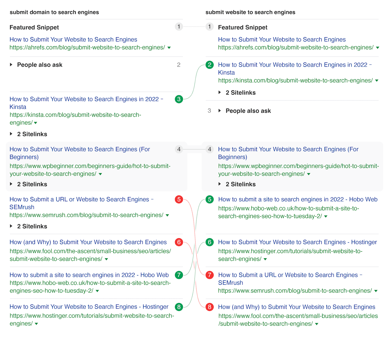 Esto se debe a que Google entiende que ambas consultas significan lo mismo, por lo que posiciona un conjunto de resultados de búsqueda casi idéntico en ambas consultas.