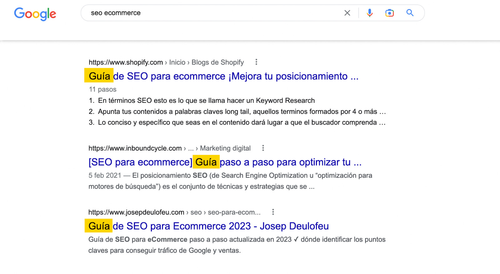 Por ejemplo, tomemos la palabra clave «SEO ecommerce». Por lo que podemos observar, la intención general de esta palabra clave parece obvia: la gente que busca esto quiere una guía que les enseñe cómo conseguir más tráfico para su ecommerce.