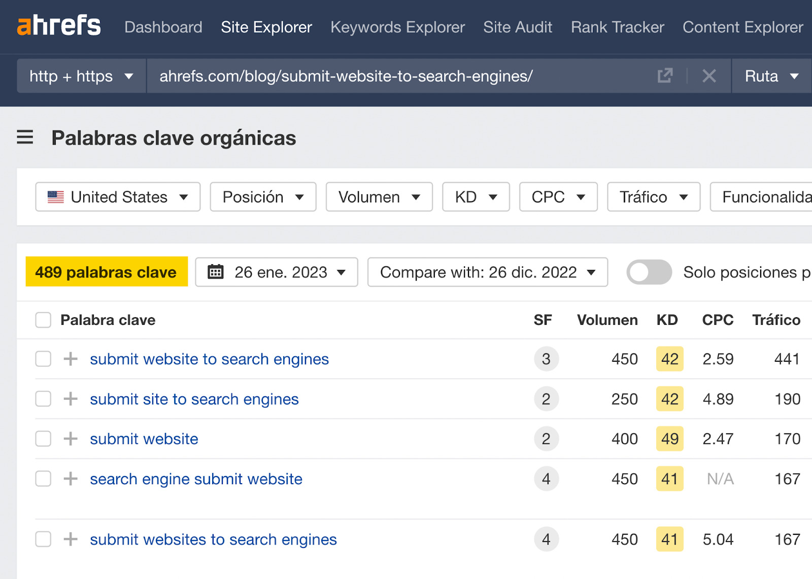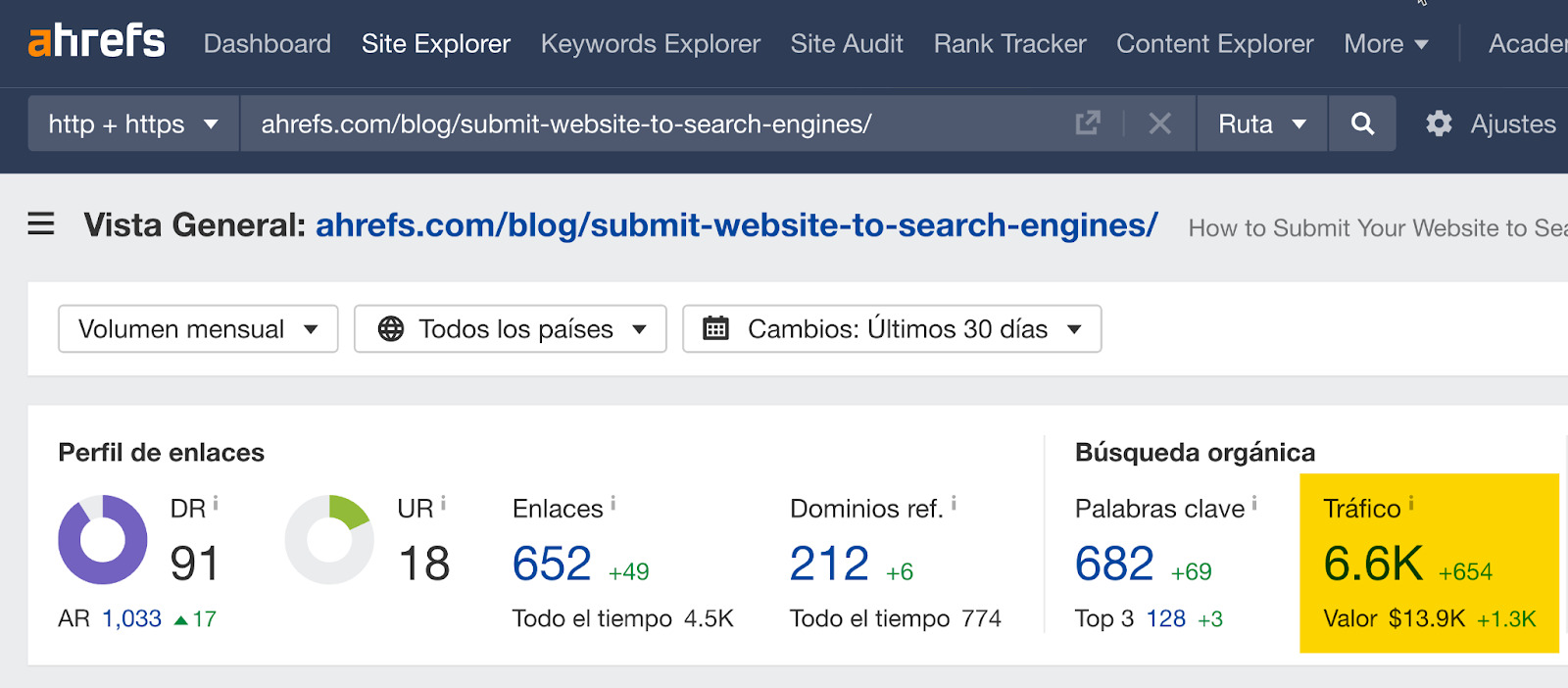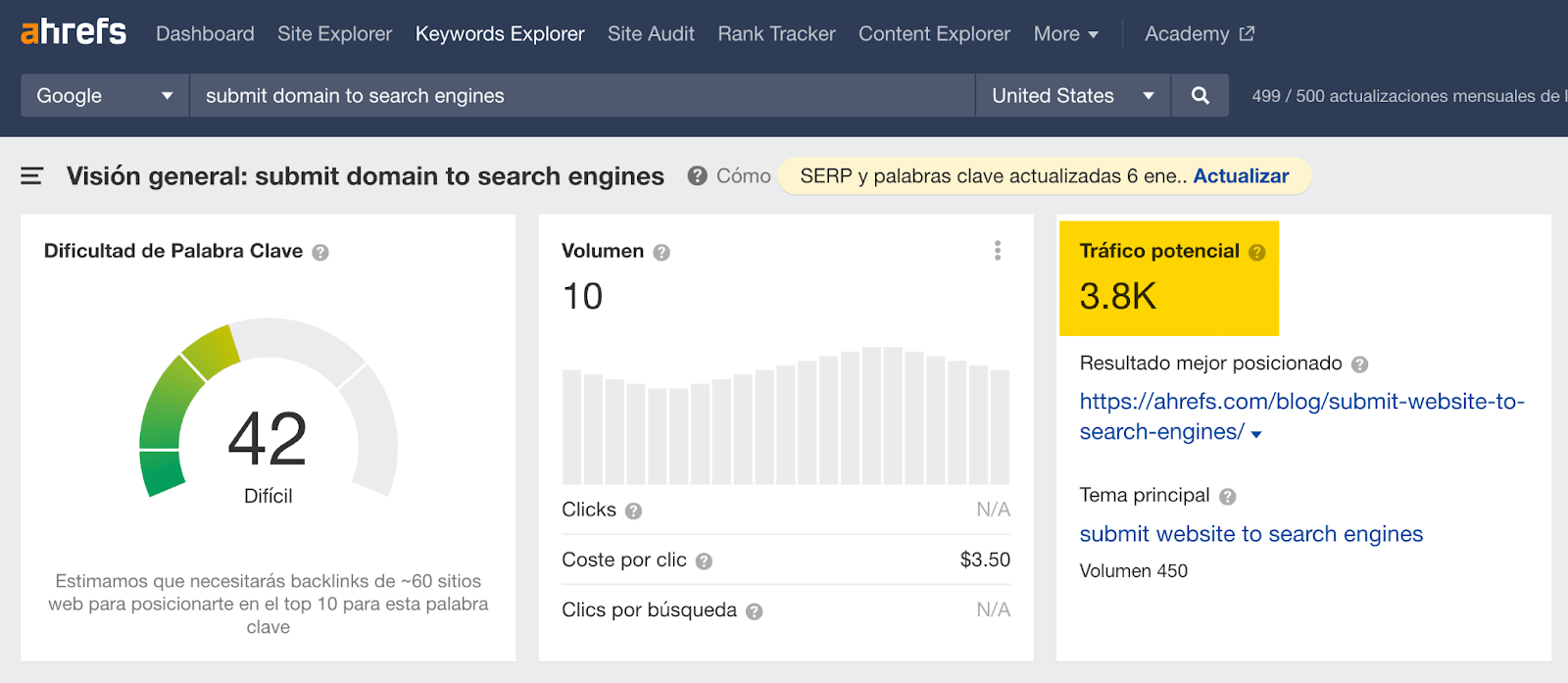 Por ejemplo, Ahrefs estima que la palabra clave «enviar web a motores de búsqueda» recibe 10 búsquedas mensuales en EE. UU. No obstante, nuestra guía de envío a motores de búsqueda recibe unas 3800 visitas mensuales.