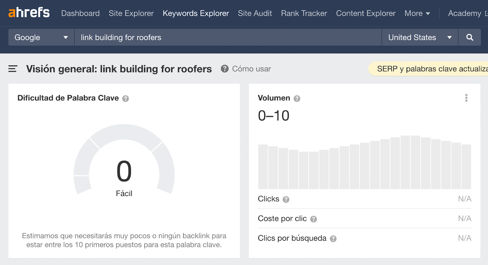 Si comparamos lo anterior con una palabra clave de volumen cero sobre un tema similar, «link building para techadores», la historia es completamente distinta, puesto que la dificultad KD es 0.
