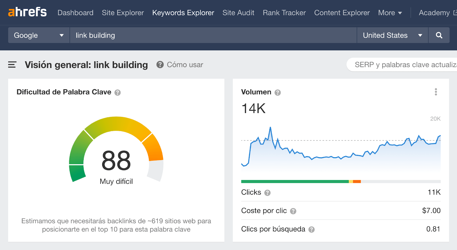Por ejemplo, según Keywords Explorer de Ahrefs, la palabra clave «link building» recibe unas 14 000 búsquedas mensuales en EE. UU. Es decir, es una palabra clave extremadamente competitiva y tiene una puntuación de Dificultad de palabras clave (KD) de 88.