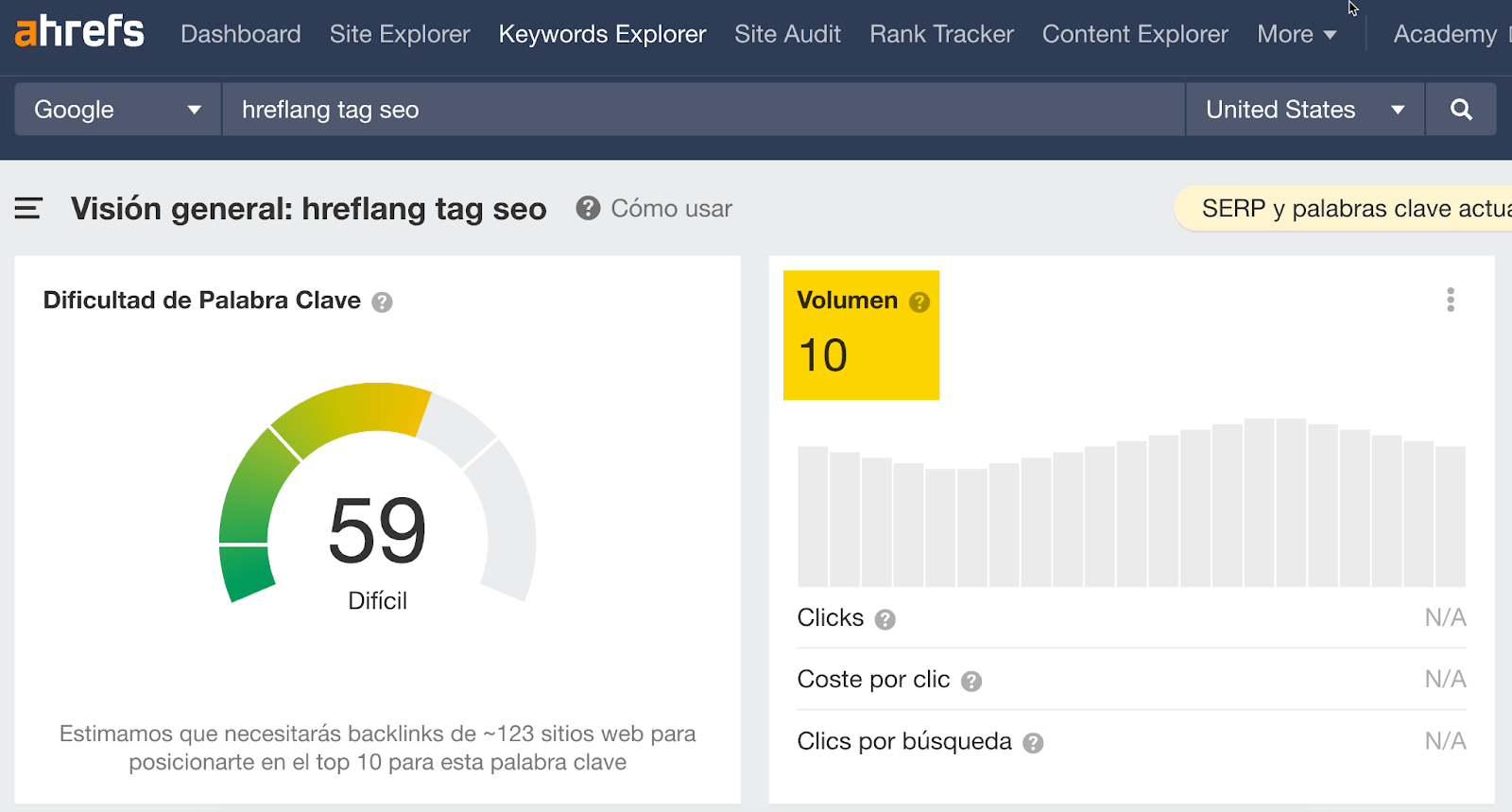 Por ejemplo, la palabra clave «hreflang tag seo» recibe unas 10 búsquedas mensuales en Estados Unidos, según la herramienta Keywords Explorer de Ahrefs.