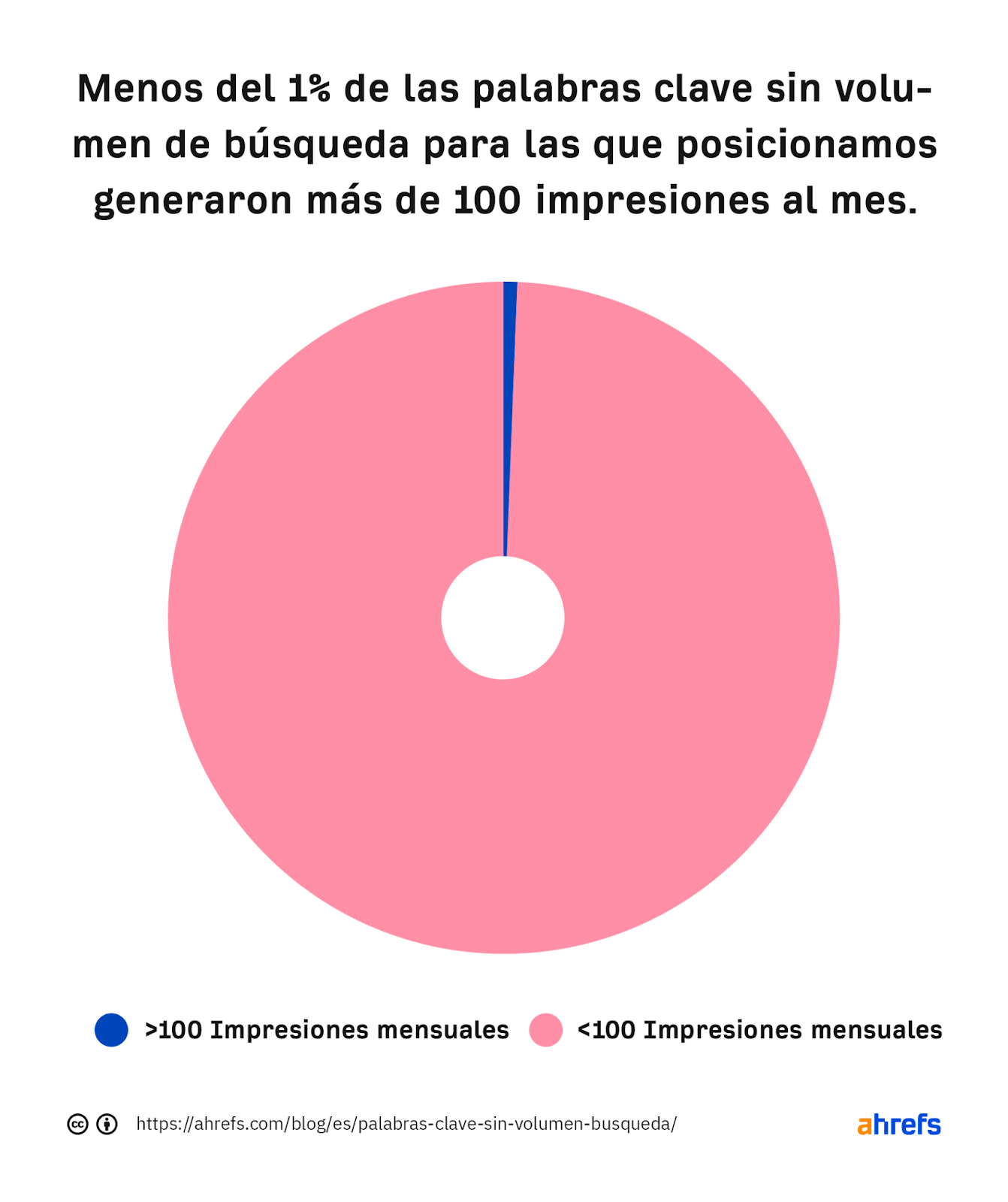 ¿El resultado? La mayoría de las palabras clave generaron el mismo número de impresiones o menos que sus volúmenes de búsqueda estimados en Ahrefs. Peor aún, menos del 1 % generó más de 100 impresiones.