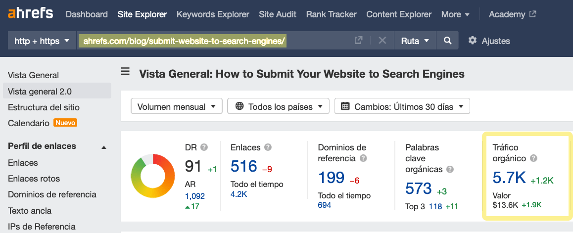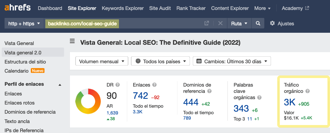 Comprobémoslo en el Site Explorer de Ahrefs: