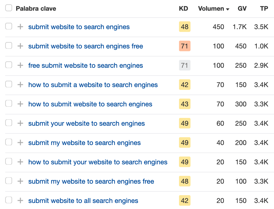 La gran mayoría de las herramientas de SEO imitan este comportamiento porque (supuestamente) toman sus volúmenes de búsqueda del planificador de Google. Por lo tanto, mostrarán el mismo volumen de búsqueda para cada una de estas variaciones de palabras clave.