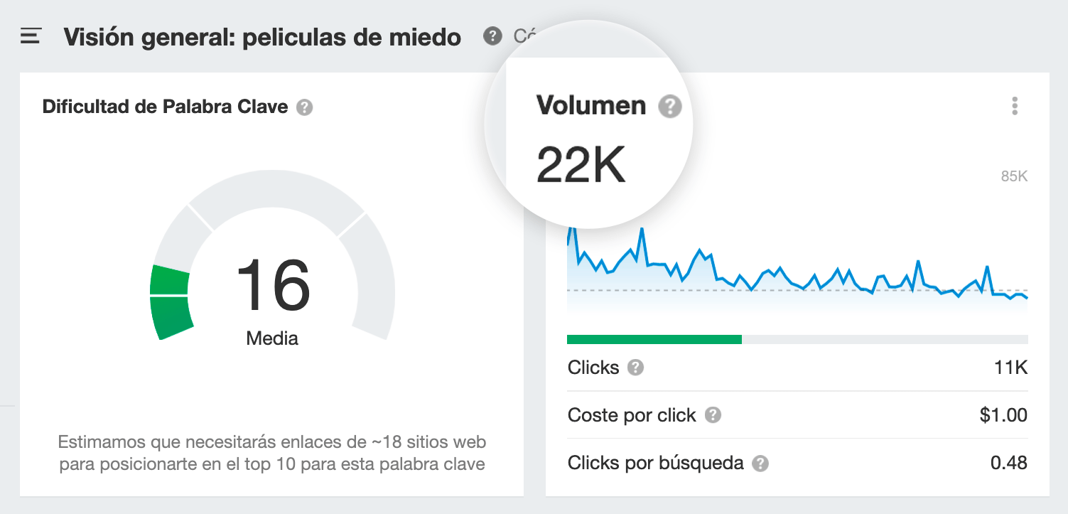 Por ejemplo, la palabra clave “películas de miedo” obtiene 22.000 búsquedas cada mes (de media). Pero la cantidad de clics en los resultados de búsqueda (según Ahrefs) es de sólo 11.000.