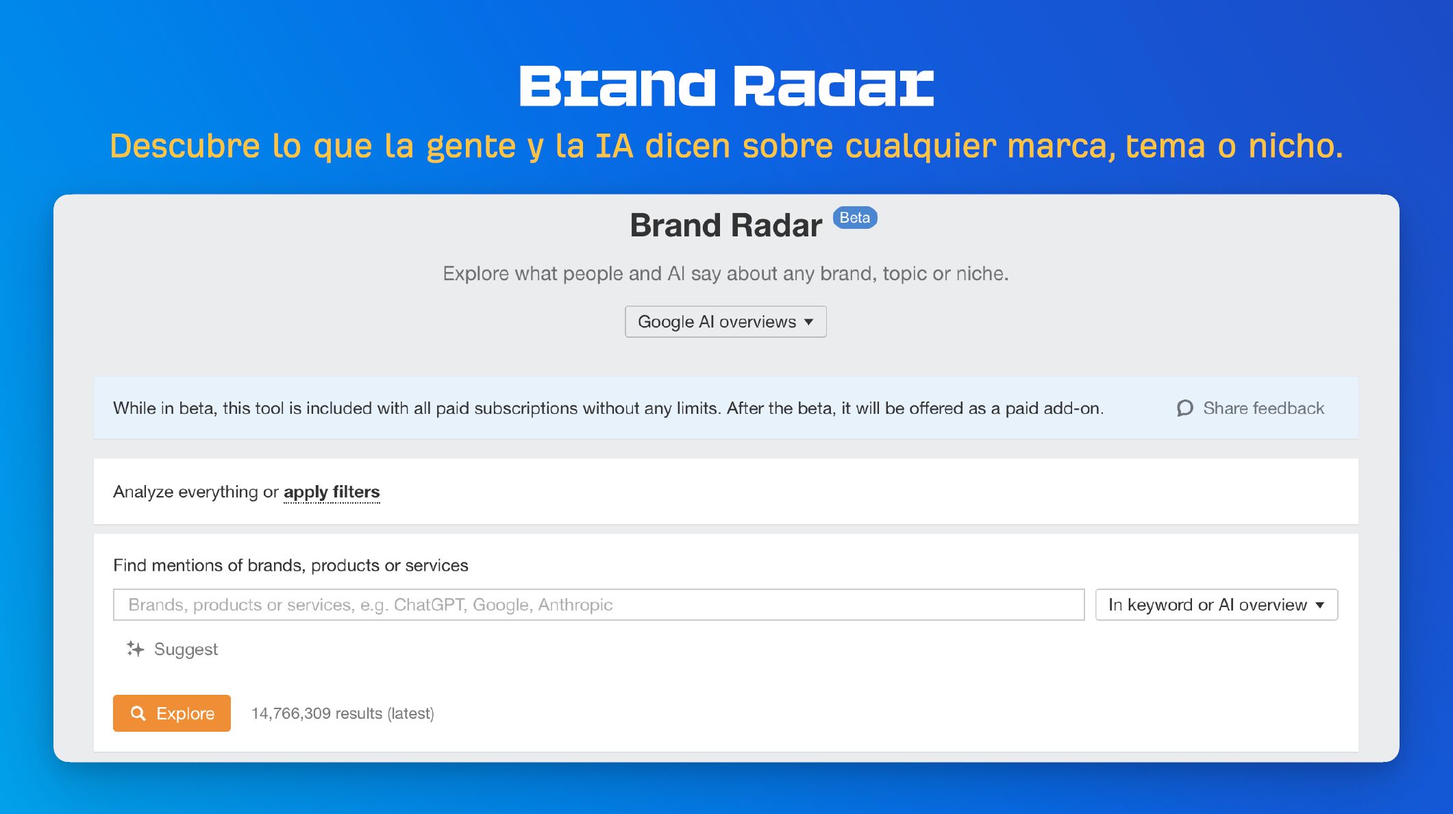 Para añadir más complejidad, la forma en que se menciona tu marca difiere de un LLM a otro. Entonces, ¿cómo se puede hacer un seguimiento eficaz de todos ellos? Puedes usar nuestra nueva herramienta Brand Radar para analizar la visibilidad de tu marca en general y también en los LLM (Por el momento se basa en la información de AI Overviews pero se irá expandiendo).