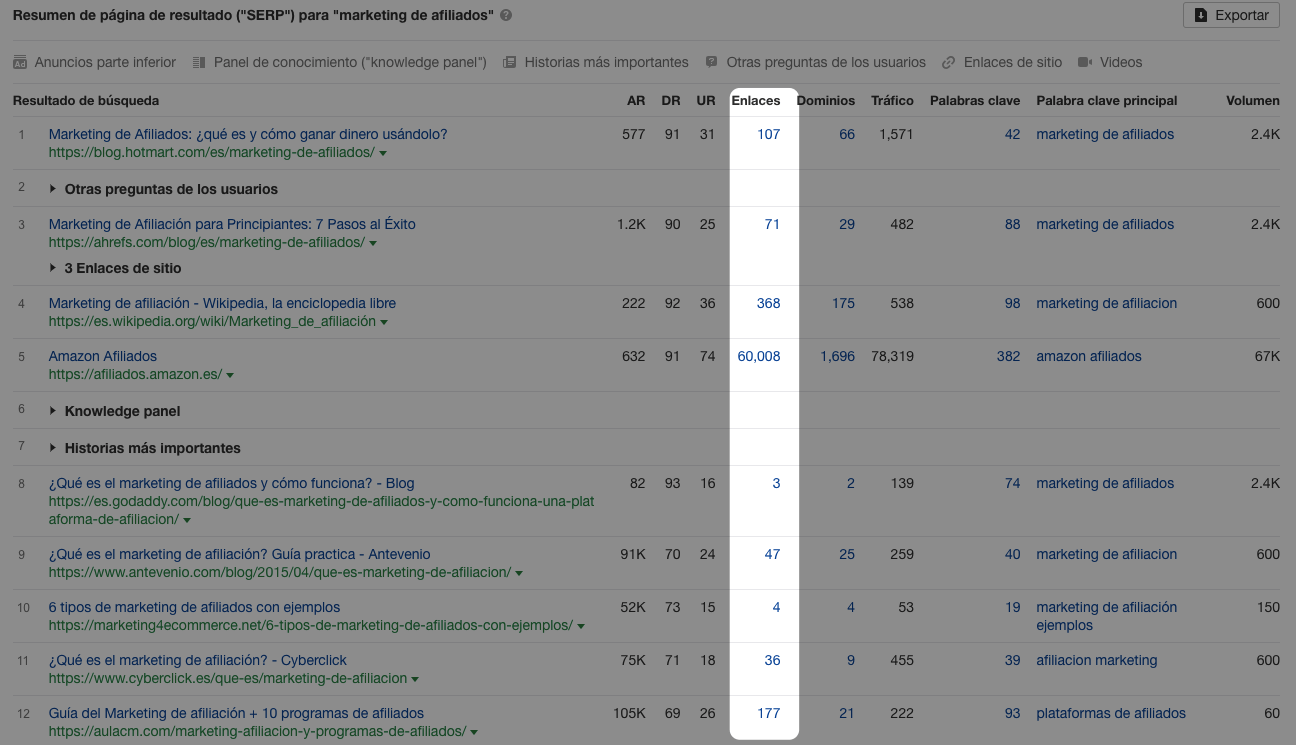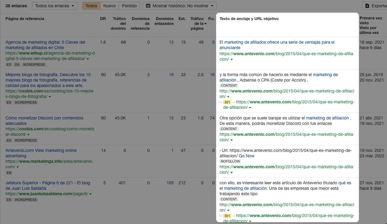 Por ejemplo, si hacemos esto con el post de marketing de afiliados de Antevenio, podemos ver que la mayor parte de la gente lo enlaza por su explicación del término, algo que debes cuidar si vas a tratar el mismo tema.