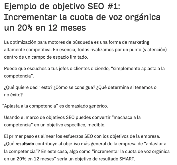 Por ejemplo, (¿te das cuenta de lo que he hecho aquí?), cuando hablamos sobre crear objetivos SEO, no solo te ofrecemos el marco. Te damos tres ejemplos de objetivos distintos y su aspecto al natural.
