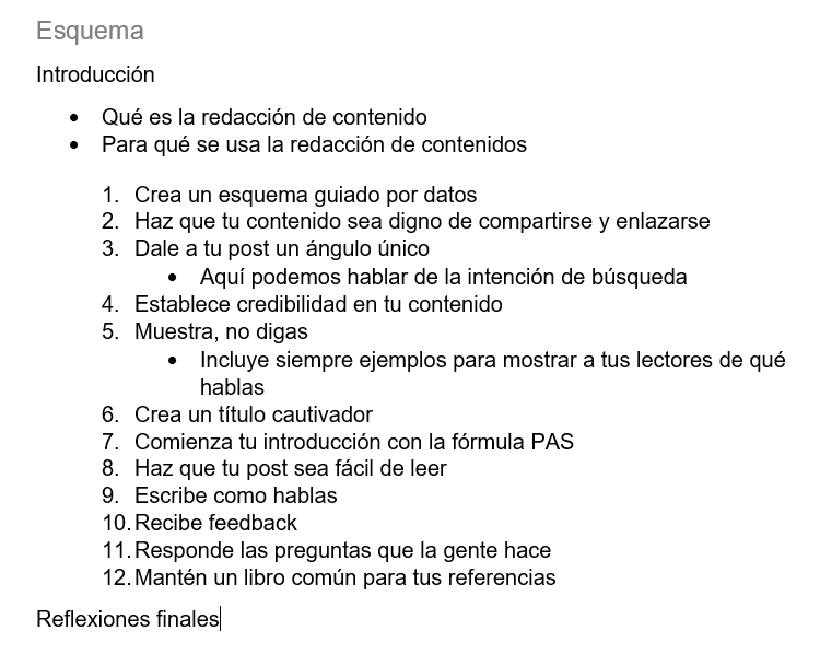 Por ejemplo, nos encontraríamos bastante rápido con el bloqueo del escritor si intentamos escribir este post de principio a fin sin crear un esquema.