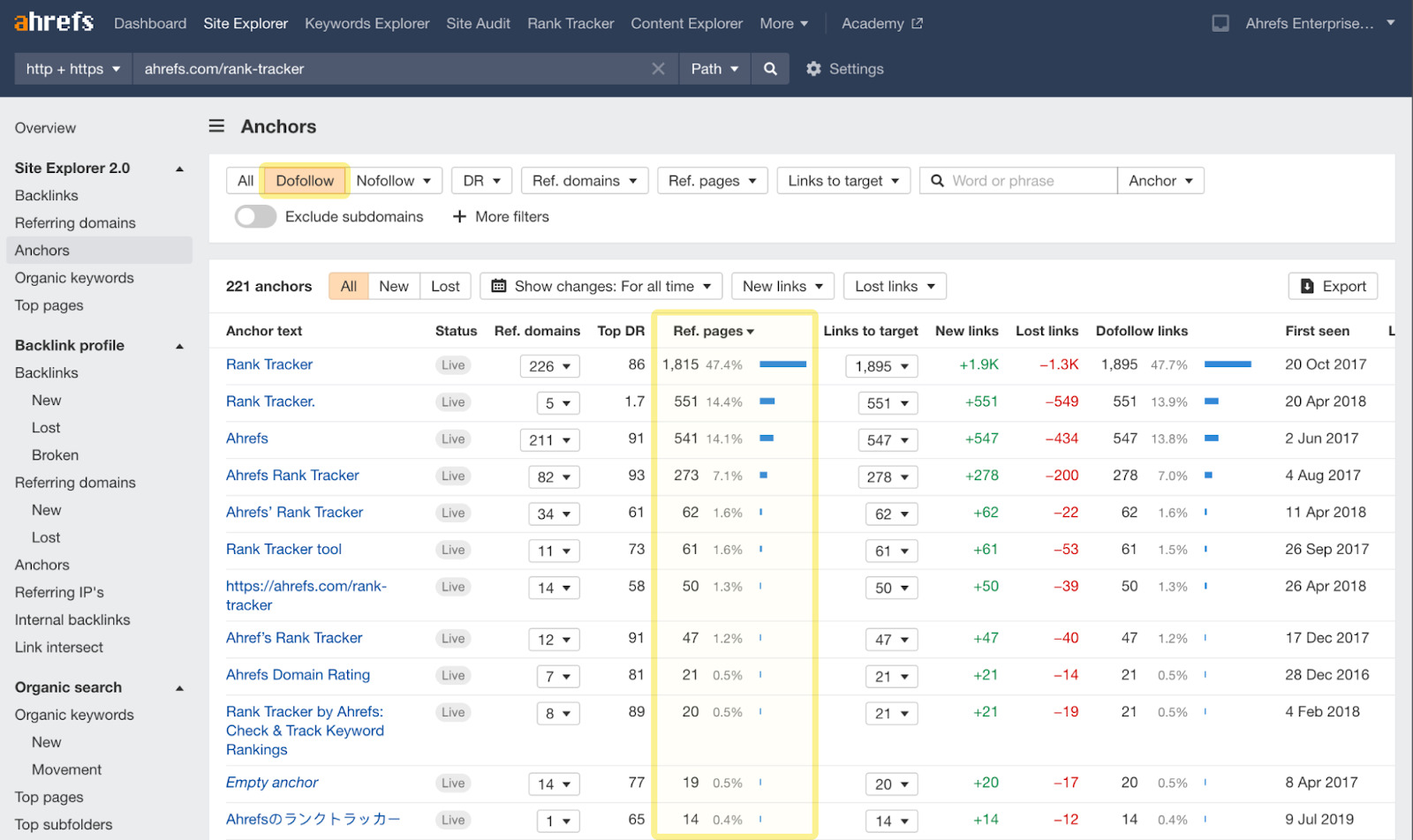 Usa los gráficos de dominios de referencia y páginas en Site Explorer de Ahrefs para identificar rápidamente picos en tu perfil de enlaces.