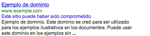 Estoy seguro de que no haría clic en un resultado así. Así que si tu sitio se marca como hackeado, puedes dar por hecho que tu posicionamiento se va a hundir.