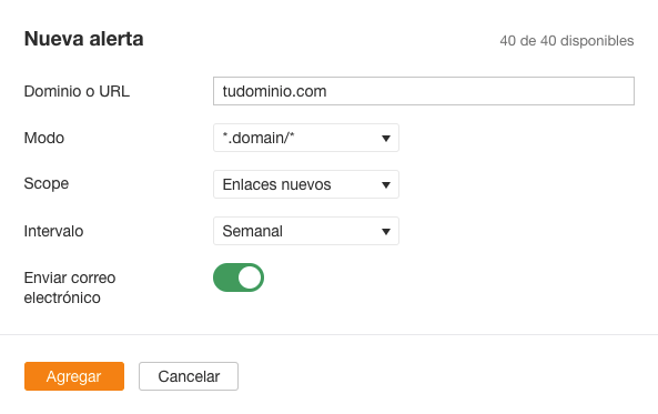 Alertas > Enlaces > Nueva alerta > Introduce dominio > Nuevos enlaces > Establece intervalo del email > Agregar