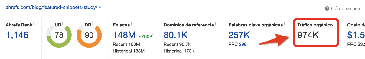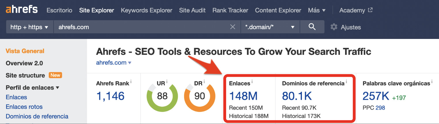 Como puedes comprobar, ahrefs.com tiene 148 millones de backlinks de 80.100 dominios de referencia.