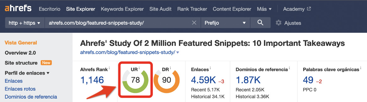 La UR muestra la fuerza del perfil de backlinks de una URL objetivo en una escala de 0 a 100.