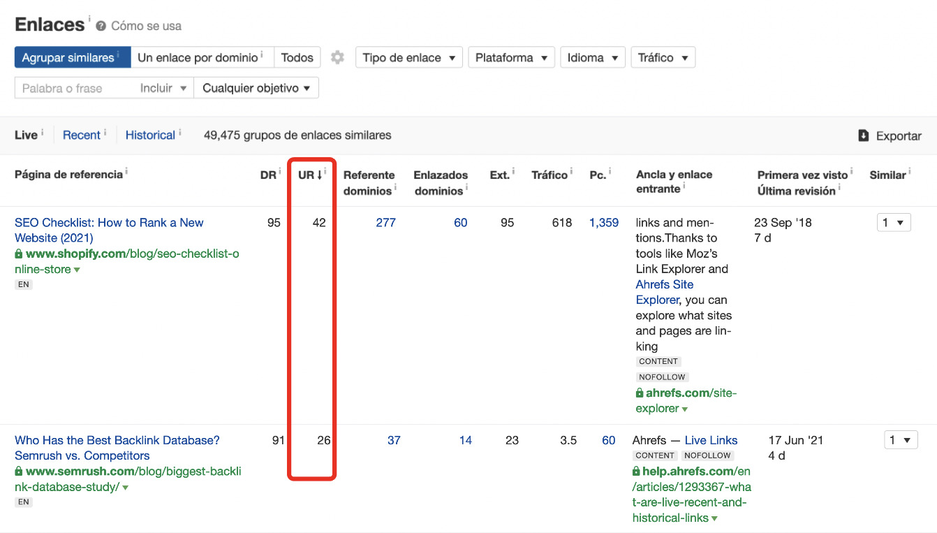 Si quieres imitar los backlinks de tus competidores, o estás llevando a cabo una táctica de construcción de enlaces como la Skyscraper Technique (la técnica del “rascacielos”), puedes clasificar el informe por tráfico orgánico para priorizar y buscar los enlaces de las páginas de más valor.