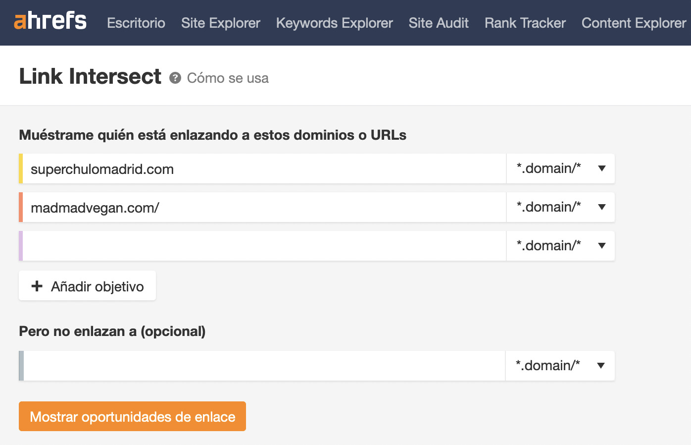 Una solución es utilizar una herramienta dedicada a la búsqueda de menciones (por ejemplo, Whitespark). Otra es utilizar algo como el Link Intersect Tool de Ahrefs, que busca sitios web que enlazan con varios competidores, pero no con tu web. Dado que muchas menciones de NAP también tienen enlaces, pero “nofollowed”, esto suele revelar las menciones que tienen tus competidores, pero no las tuyas.