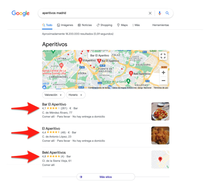 Estos perfiles son los que aparecen en los resultados destacados que salen en Google cuando buscamos “aperitivos Madrid”, por ejemplo. Se encuentran en la parte superior de los resultados de búsqueda para la intención de búsqueda local.