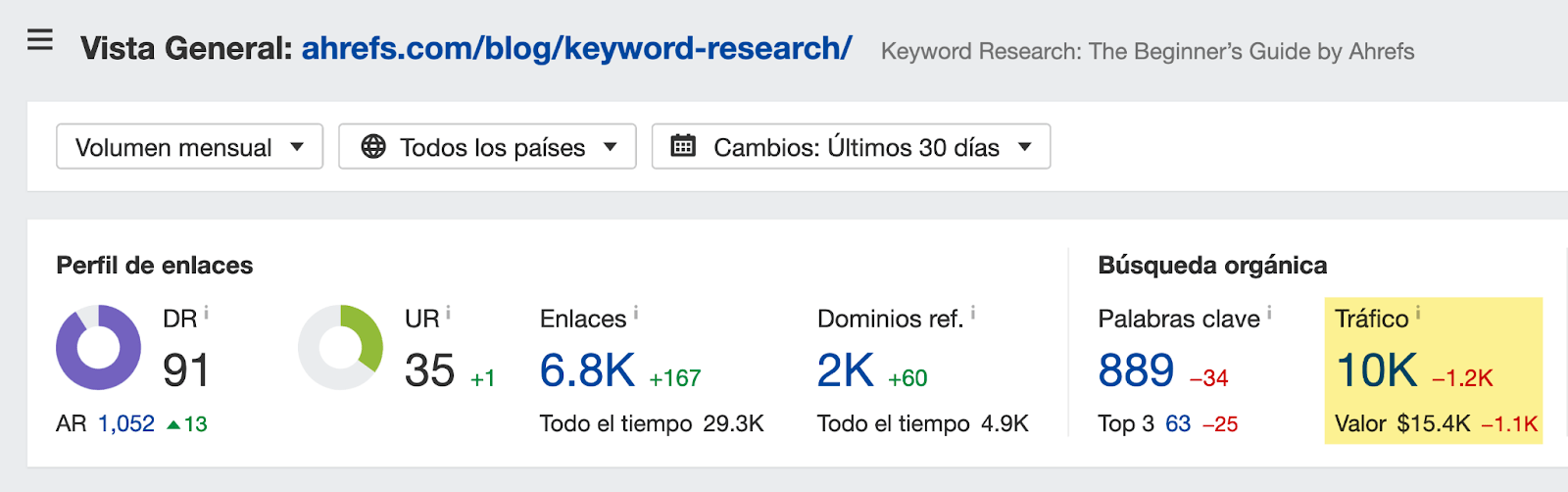 Por ejemplo, nuestra guía sobre keyword research se diseñó para explicar cómo resolver el problema del título usando Ahrefs. Al conseguir un posicionamiento alto en términos relevantes como “cómo hacer investigación de palabras clave” y “análisis de palabras clave en SEO”, nos aporta tráfico gratuito.