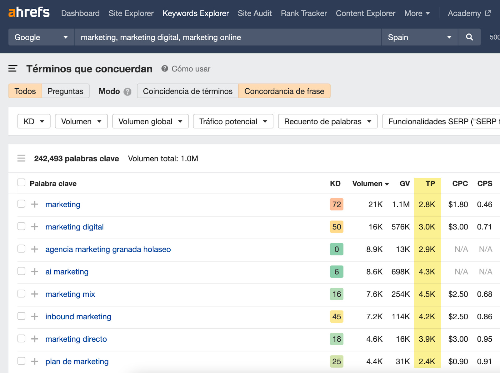 - Obtén ideas de palabras clave en la columna del potencial de tráfico (TP).