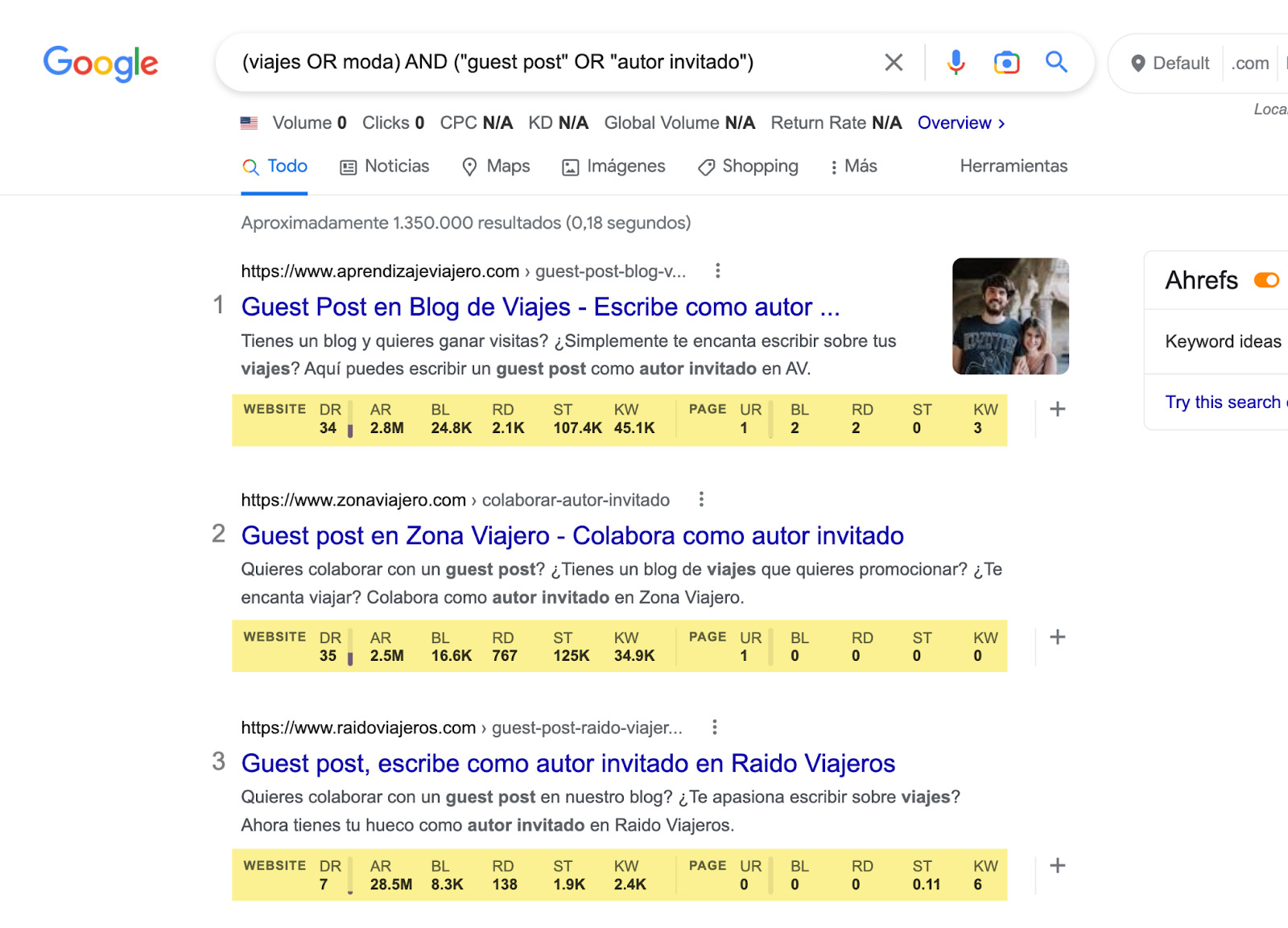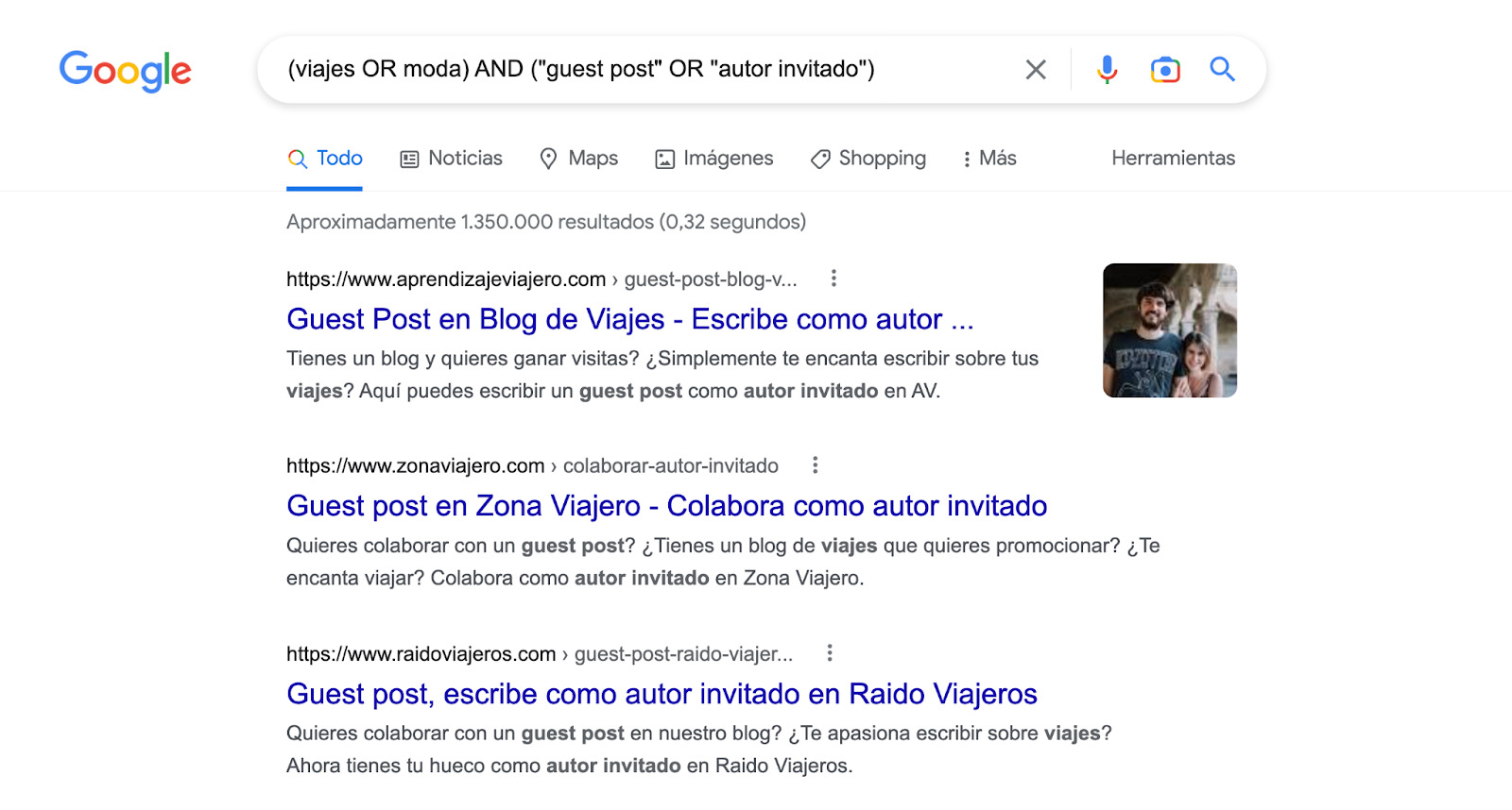 Se pueden encontrar oportunidades de guest posts simplemente buscándolas en Google. Puedes utilizar operadores de búsqueda para obtener resultados más relevantes. Por ejemplo, (viajes OR moda) AND ("guest post" OR "autor invitado") .