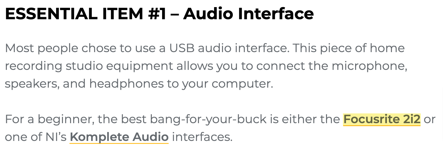 A partir de ahí, los afiliados están listos para incluir tus productos en su contenido (si creen que merece la pena recomendarlo). Por ejemplo, aquí hay un artículo sobre la creación de un estudio de grabación en casa por Musician on a Mission.