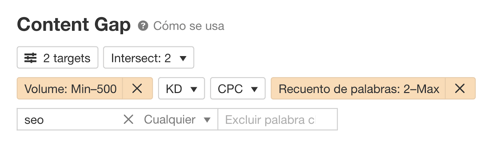 - Puedes utilizar los filtros para obtener una lista más precisa. Por ejemplo, recuento de palabras a partir de 2, volumen a partir de 500, palabras clave que incluyan “seo”