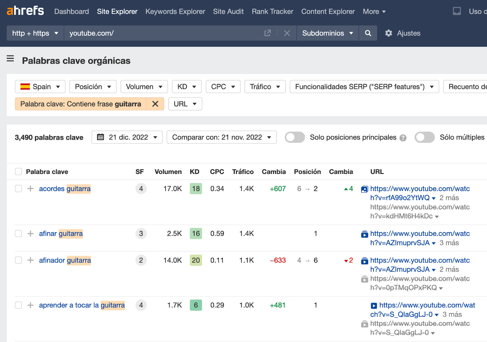 - Dirígete al informe de Palabras clave orgánicas, allí obtendrás las palabras clave en las que los vídeos de YouTube se posicionan en las SERP (páginas de resultados de los motores de búsqueda)