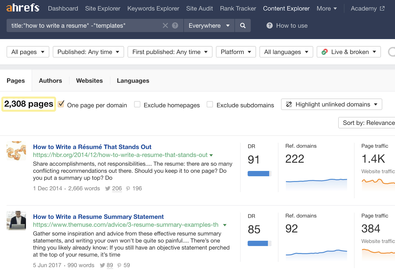 Puedes encontrar estas páginas muy fácilmente en Content Explorer, una base de datos accesible de miles de millones de páginas web. Aquí tienes cómo: