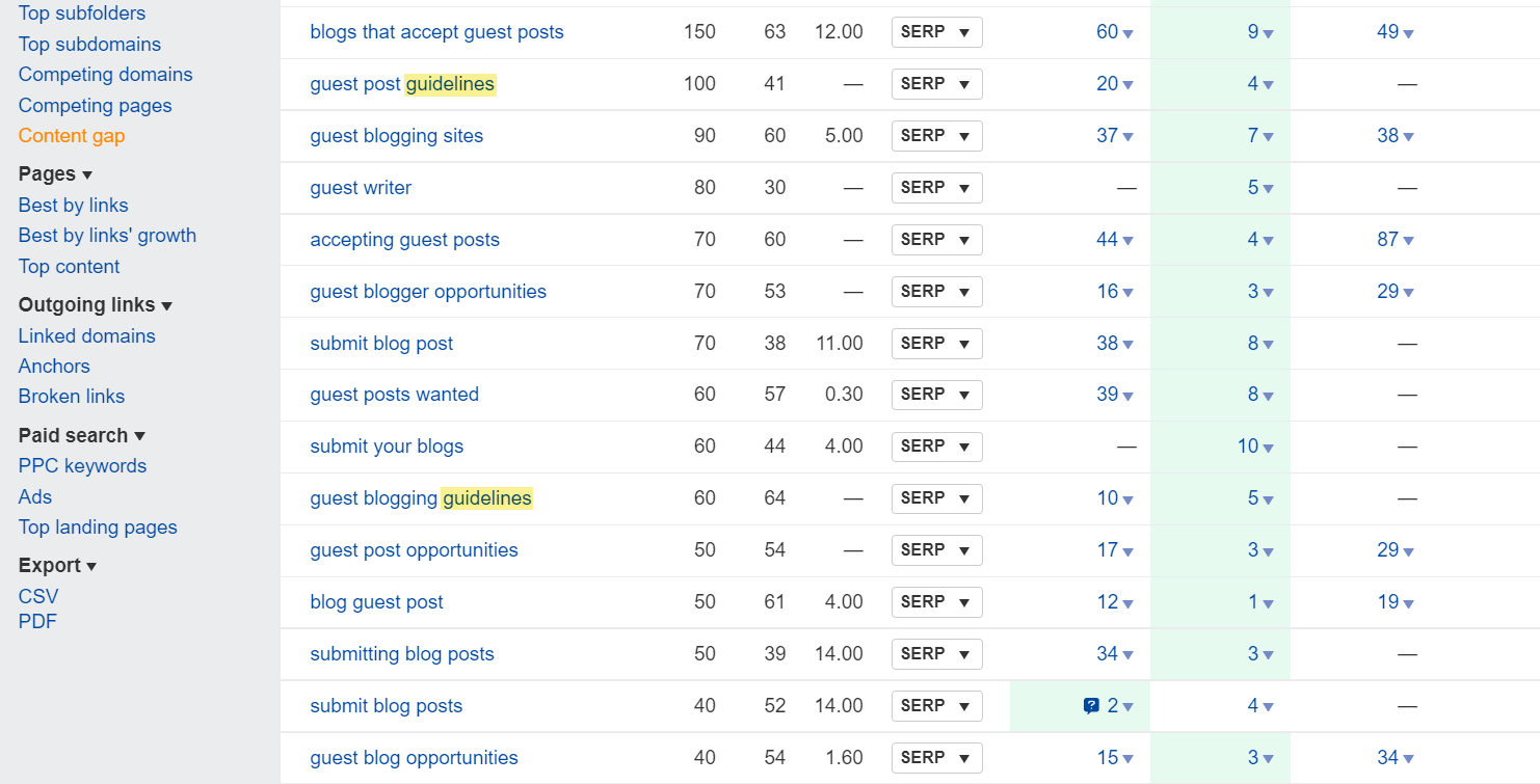 La forma más fácil y eficiente es realizar un análisis de content gap (brecha de contenidos) para tu página. Esto te muestra palabras clave en las que las páginas mejor posicionadas posicionan y tú no, algo que suele representar subtemas.