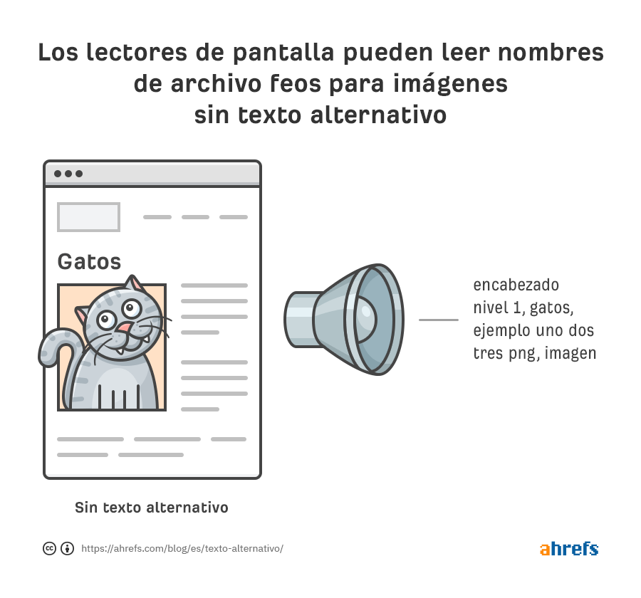 Las imágenes sin texto alternativo causan problemas a los lectores de pantalla porque no hay forma de comunicar el contenido de la imagen al usuario. Por lo general, omiten estas imágenes o, lo que es peor, leen el largo e inútil nombre de archivo.