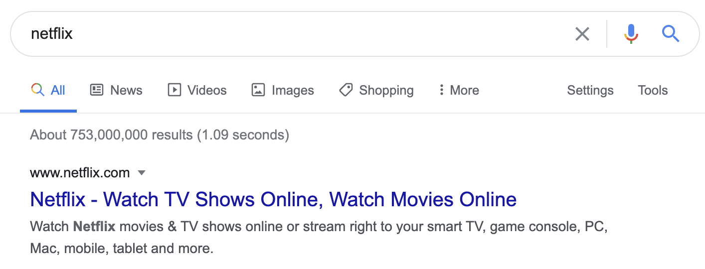 Las búsquedas de navegación son cuando alguien busca una web específica. Por ejemplo, si alguien escribe “netflix” en Google, es una búsqueda navegacional porque casi seguro que están buscando la página principal de Netflix.