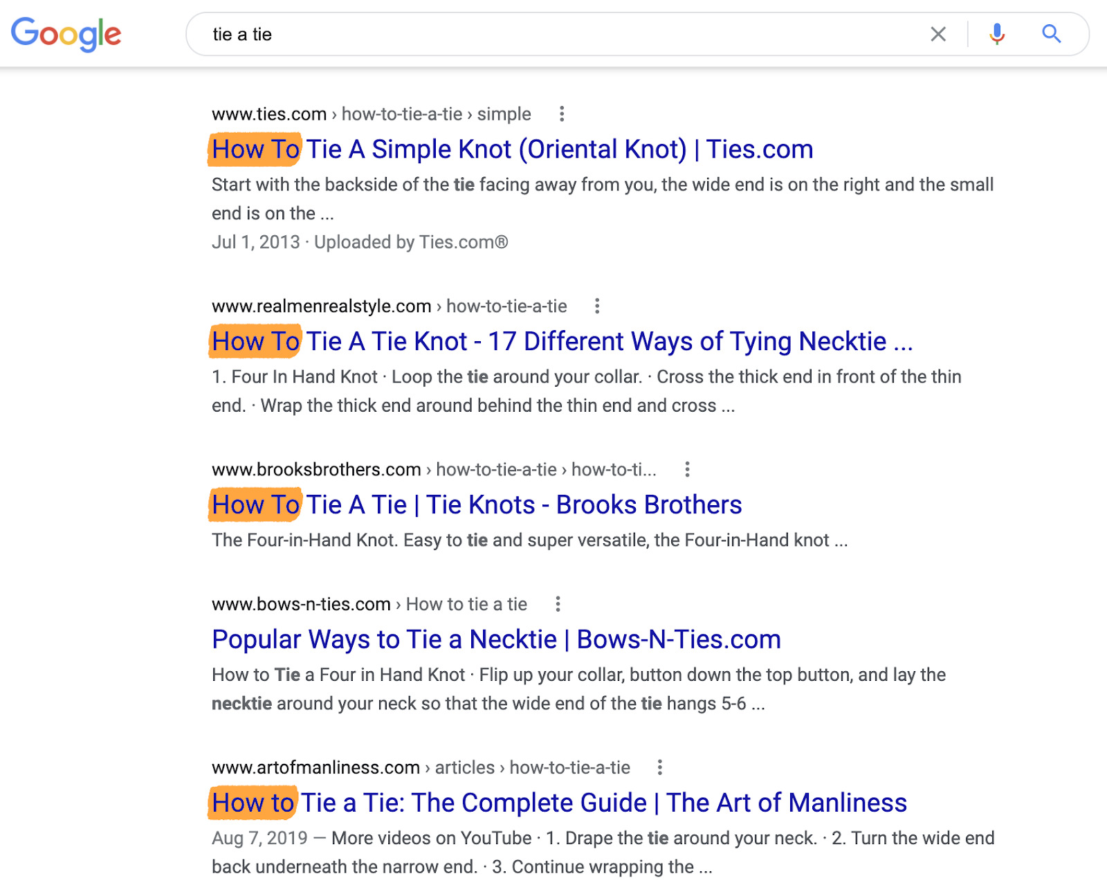 Por ejemplo, la mayor parte de los resultados de “tie a tie” (hacer el nudo de la corbata) son guías que explican cómo hacerlo (how-to):